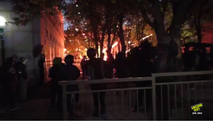 Riot police entered the courtyard that the fence had once protected, and that is when protesters set fireworks off into the courtyard.