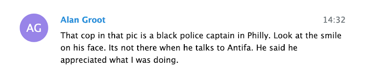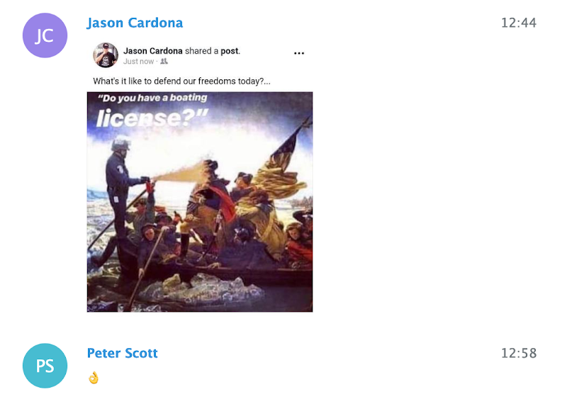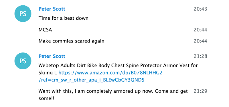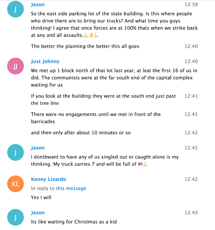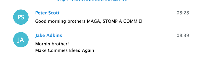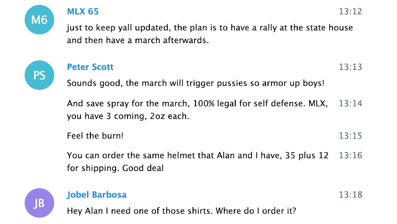 Chat participant ‘Zee Ferguson’ was a member of a III% militia group, and Kyle “Based Stickman” Chapman is the California-based founder of both the street combat group the Fraternal Order of Alt-Knights, and Resist Marxism. Proud Boy Chris White is from Florida, and Proud Boy Dan ‘Based Couch Man’ Sutherland is from Michigan.