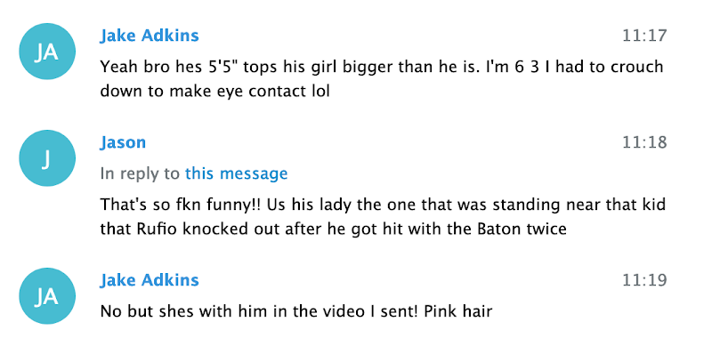 Proud Boys and members of other far-right groups in the chats hail from all corners of the continental United States, including the Pacific Northwest, the Northeast, and the Midwest. For example, Patriot Prayer associate Chris Ponte, Proud Boy Jake Adkins, and Proud Boy Tiny Toese, were all participants in the May 1, 2019, attack on the bar Cider Riot in Portland, OR.