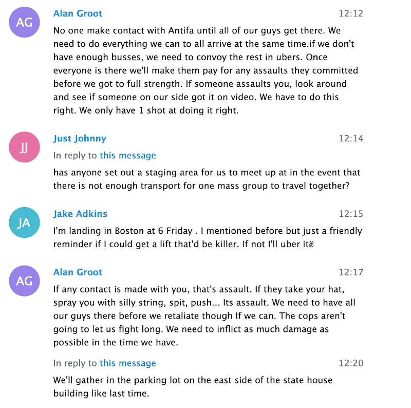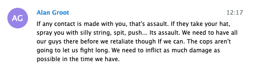 “If any contact is made with you, that’s assault. If they take your hat, spray you with silly string, spit, push… Its assault. We need to have all our guys there before we retaliate though If we can. The cops aren’t going to let us fight long. We need to inflict as much damage as possible in the time we have”, Swinney told the men, using the screen name “Alan Groot.”