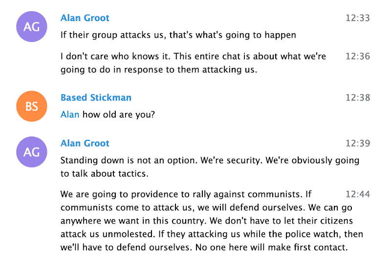 The ‘East Coast Patriot Nomads’ chats were organized by far-right activist Alan Swinney, who recently attracted attention for aiming a revolver at protesters in Portland, and for injuring a woman while shooting paintballs at protesters. The messages reveal the strategy of the far-right groups and persons involved– to hold events as a pretense for attacking protesters, then claiming self-defense. In the case of the planned Providence rally, Resist Marxism would have provided the event itself, a reason to gather, with the East Coast Patriot Nomads, with whom Resist Marxism overlapped and was collaborating, providing the violence.