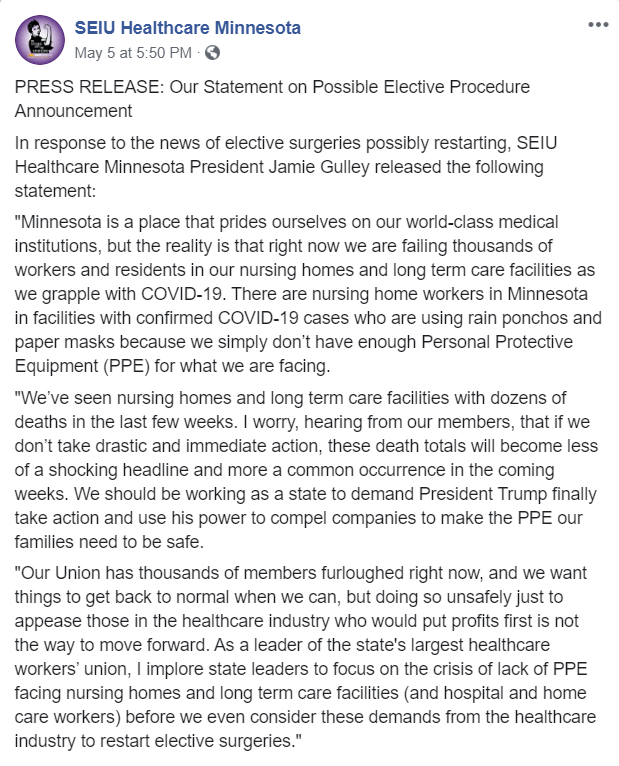 Some Minnesota nursing home healthcare workers have been improvising gowns from rain ponchos “because we simply don’t have enough PPE,” according to SEIU Healthcare Minnesota president Jamie Gulley in a May 5 press release.