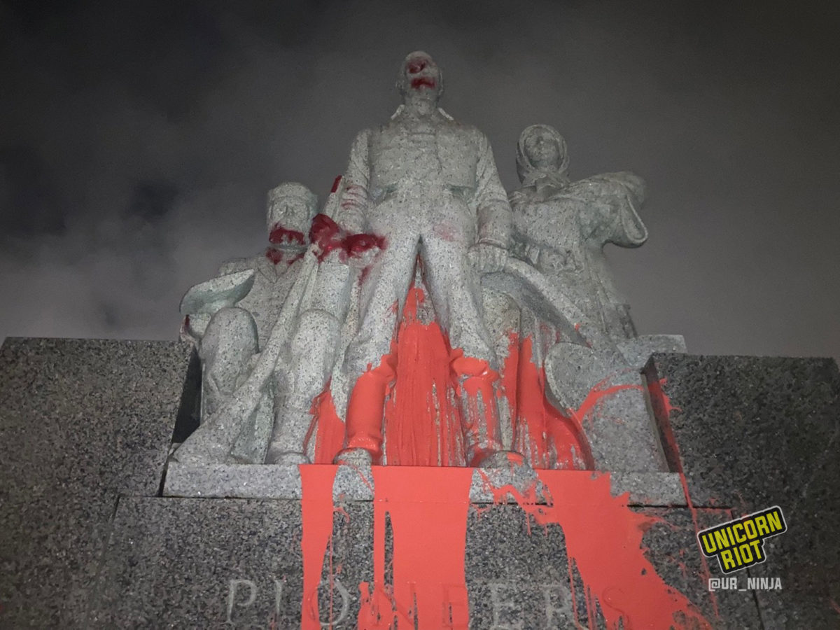 “Statue of genocidal George ‘Town Destroyer’ Washington—settler-colonial war criminal & racist slaveowner—toppled at Washburn Fair Oaks Park. The ‘Pioneers’ statue at BF Nelson Park (donated by the capitalist Pillsbury family), memorializing the invasion of Dakota lands, redecorated to reveal its true purpose. It must fall.