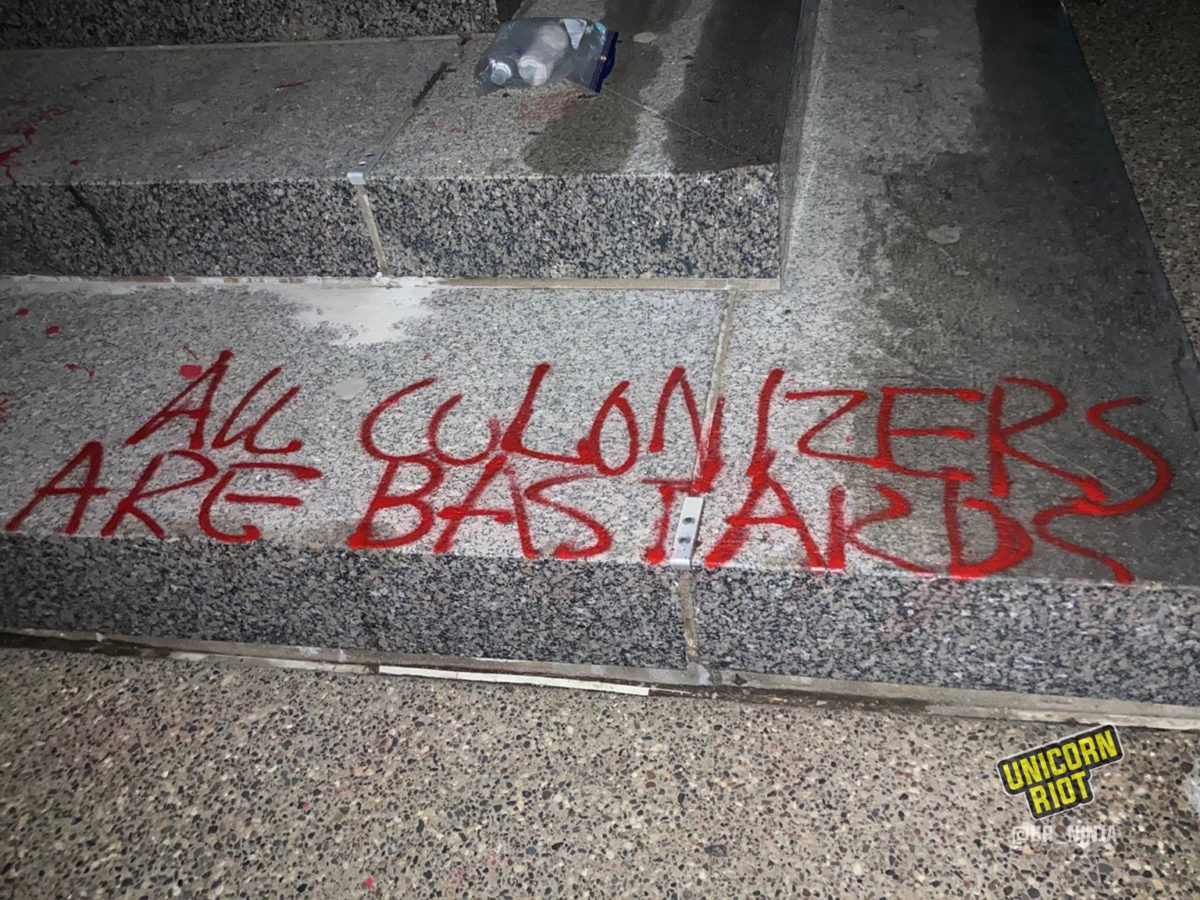 An autonomous direct-action affinity group organizing under the Pan-Indigenous People’s Liberation (PIPL) network took credit for the action, which they say was partly in response to the callout for a “national decolonial day of action.“