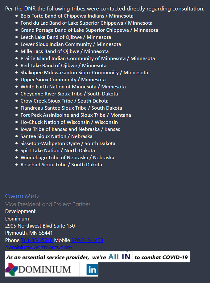 Metz also asserted that “We haven’t had any tribes speak negatively against” the proposed development. When Unicorn Riot pressed Metz to name the specific tribes, he admitted that Dominium had been “made aware of regular communications to numerous tribes” and had to ask DNR for a list of tribes reportedly consulted on the project. Approaching relevant tribes to ask directly what they thought about their project’s price tag was apparently not on Dominium’s to-do list when it comes to honoring Native Americans.