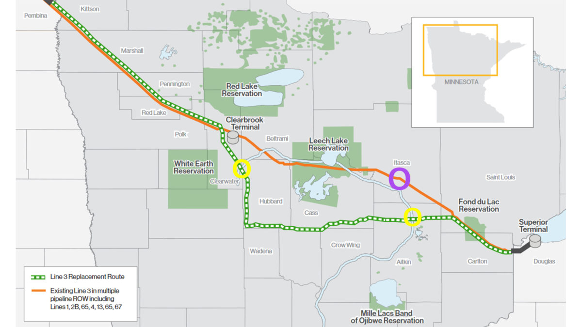 In the map below, the two yellow circles show where Enbridge intends the new pipeline to cross the Mississippi River. The purple circle shows where the 1991 Grand Rapids spill occurred.