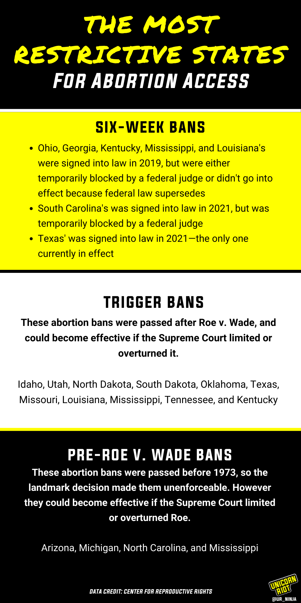 There are many more states with restrictions, and in fact only 18 states will have abortion protections if Roe v. Wade is weakened or overturned. Take a look at your state’s stance with this map created by the Center for Reproductive Rights.