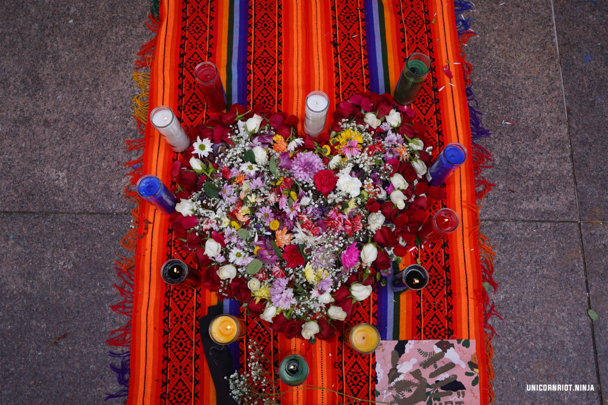 Outside of Wells Fargo, a vertical banner was hung from its sign and an alter honoring MMIWG2S was created at its base. There was singing and praying as vibrant and colorful flowers and candles were carefully arranged into a heart.