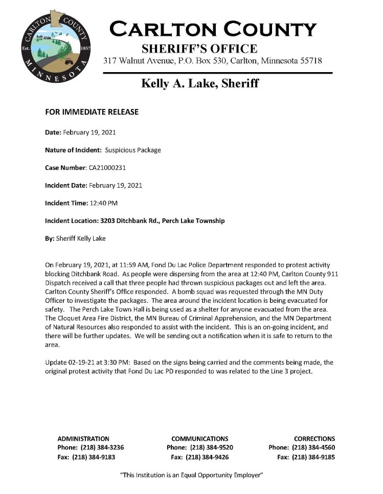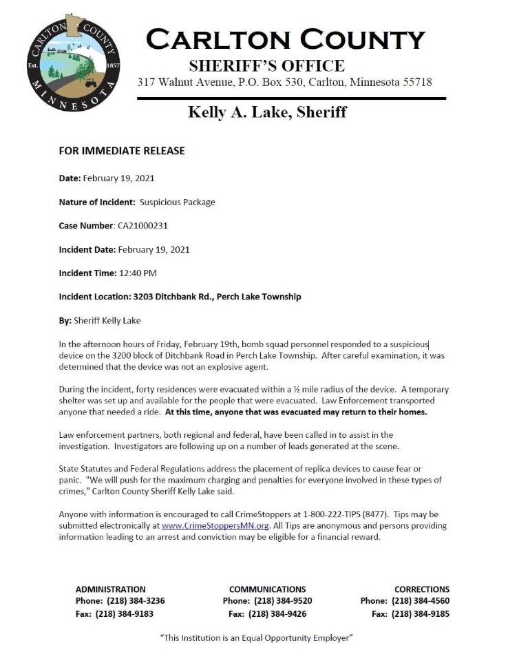 In the second release, the Sheriff’s Office states that the now-termed “suspicious device” was not “an explosive agent.” Carlton County Sheriff Kelly Lake stated: “We will push for the maximum charging and penalties for everyone involved in these types of crimes,” referring to laws against “the placement of replica devices to cause fear or panic.”