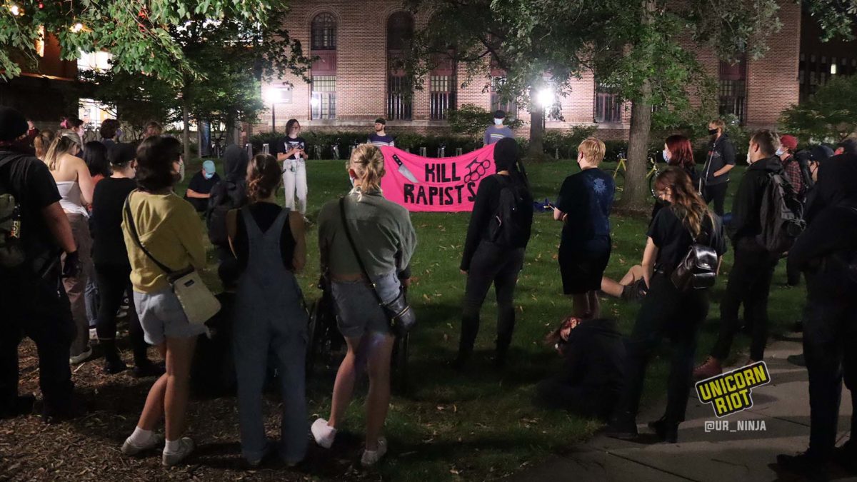 The march was similar to a march held in 2017 protesting sexual violence from frats. An organizer and participant in the 2017 march spoke with Unicorn Riot after the All Frats Are FIJI event: