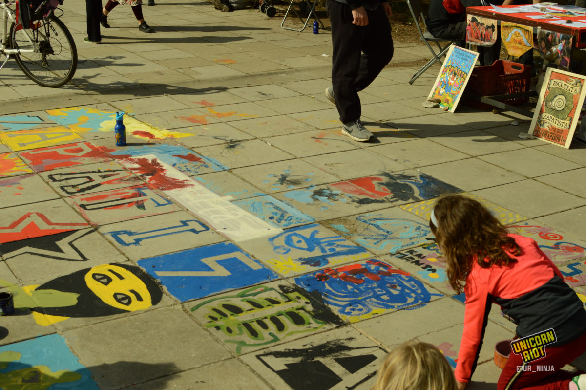 Strolling towards the square in front of the chemistry school, I see it’s full of people, families with children, youth playing soccer, skating or rollerblading, and others dancing or simply hanging out on the grass. On the farthest side of the square another gathering is welcoming the Zapatistas from Mexico visiting on their tour through Europe.