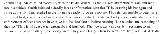 The prosecutor explained his decision and that he was “unable to determine who fired first,” but also claimed “Smith initiated a deadly force confrontation with the [task force].”