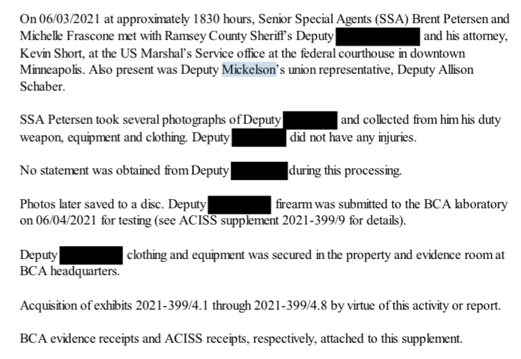 The name of the Ramsey County Deputy who seems to have fired upon Smith was also mistakenly left unredacted. Luke Mickelson was also a member of the task force and despite numerous redactions of his name, one critical mention of his name in the BCA file was present. Similar to Deputy Inglett, Mickelson had his firearm confiscated along with his uniform and equipment. Mickelson did not offer a statement to investigators at the time of the interview.