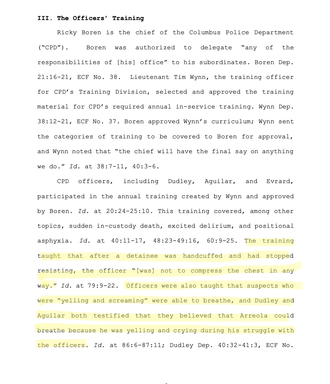 Police training provided to the Columbus Police officers was heavily scrutinized in court documents. The training was provided by Lt. Wynn, and it led to responding officers having a misconception about Arreola’s deteriorating condition. While many would assume a person saying “I can’t breath” means they need to be repositioned, instead, Columbus officers are taught that if a person is yelling or talking, they can breath fine.