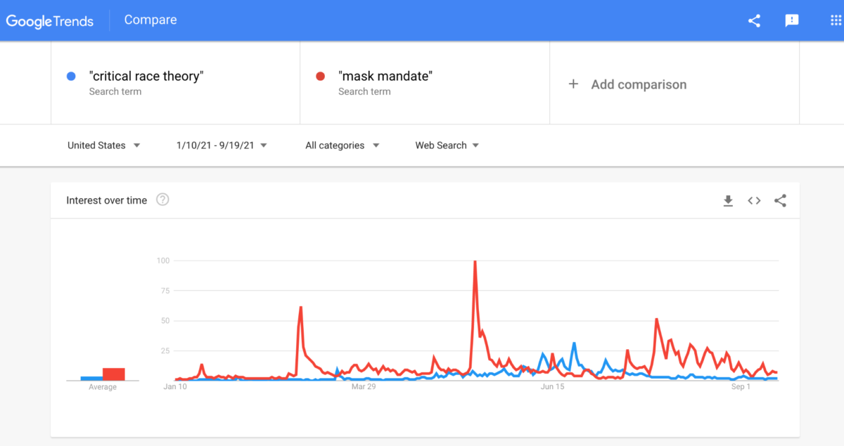 Google interactions with terms like ‘mask mandates’ relating to COVID-19 have remained relevant far longer than the term ‘critical race theory’, which peaked in early summer 2021. Research into the psychological nature of conspiracy theories has shown that belief in conspiracy is often tied to complex and disruptive socio-political events – and so as long as Covid-19 remains, it is likely that conspiracy narratives regarding the virus will remain as well.