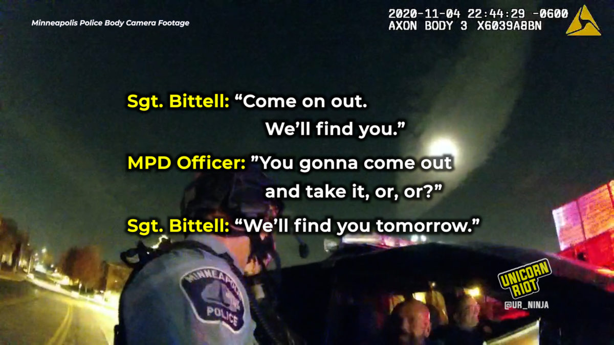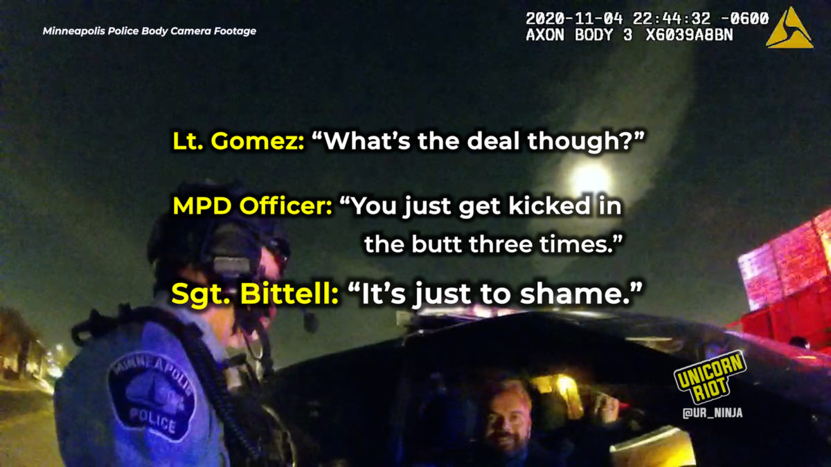 On November 3, 2020, the night before Bittell’s body camera showed him leading the ‘shame games’, he was providing strongarm support for a large police operation that arrested over a dozen people who had participated in an election night dance party on the streets of Uptown Minneapolis. Many protesters reported that they were tackled, punched, and brutalized by police during their arrests.