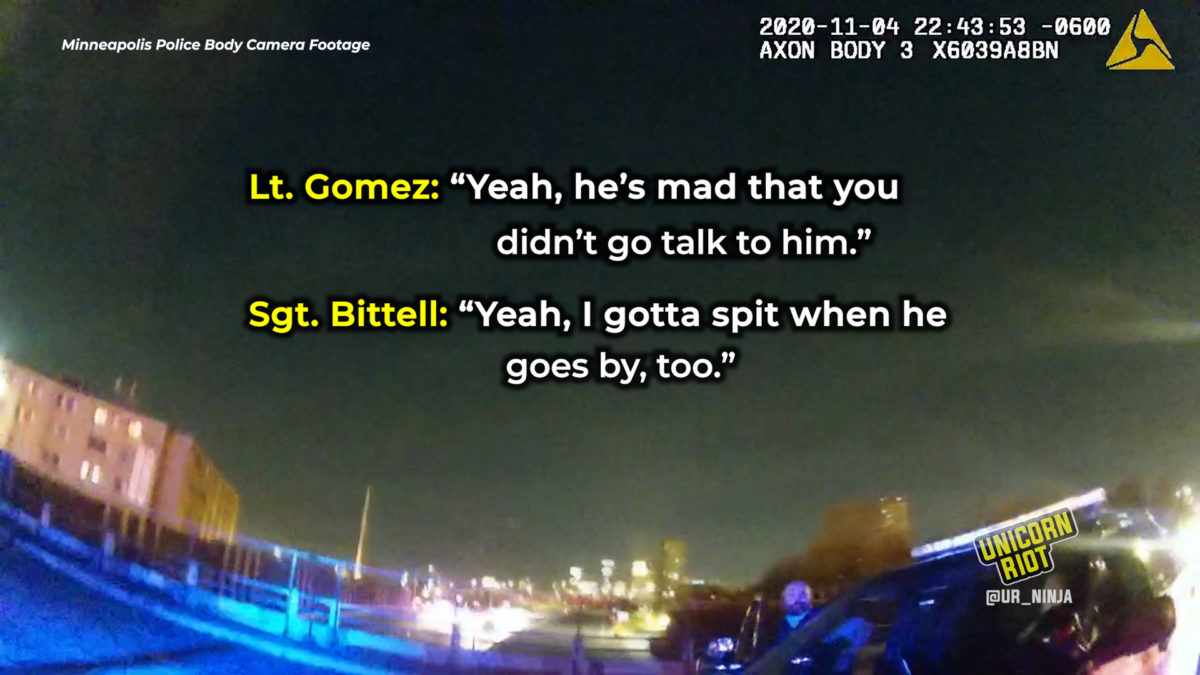 The anonymously sourced footage obtained by Unicorn Riot, which includes policemen teaming up to shame another officer, comes from body cameras worn by MPD cops assigned to the 1282 CART (Chemical Agent Response Team) team. The 1282 CART team was seen responding to a suspicious vehicle call on the night of November 4, 2020.