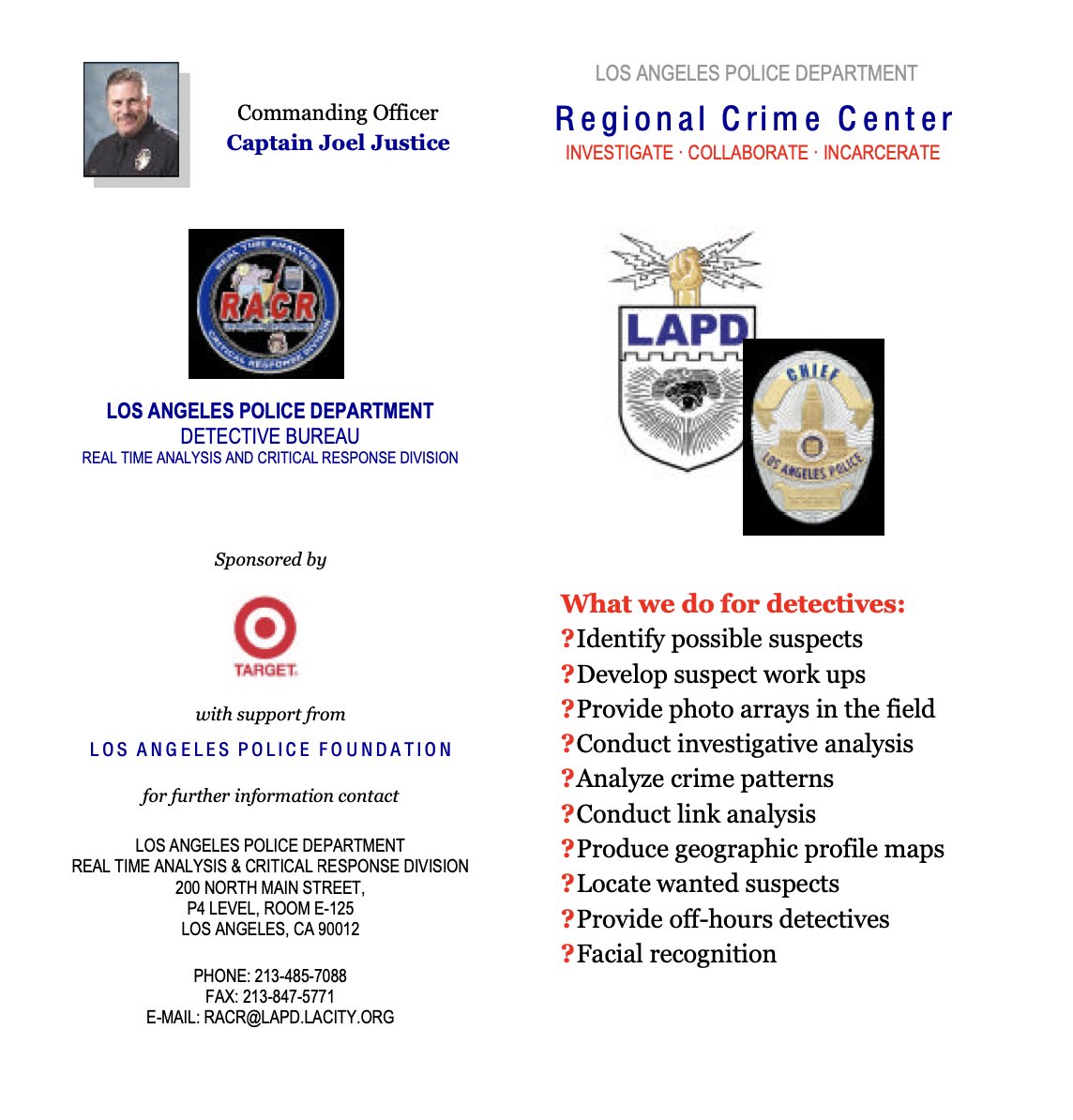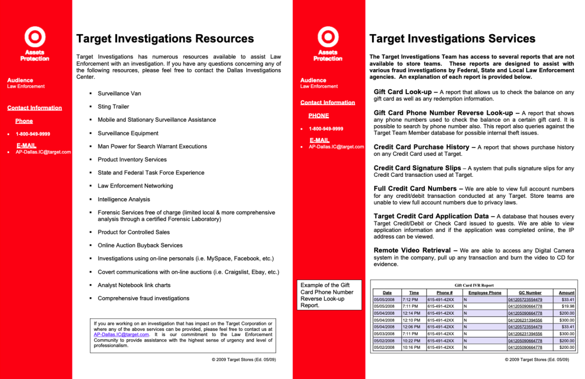 Following 9/11, Target boasted of its crime fighting capabilities, its partnership with police around the world, its two state-of-the-art forensics labs, and the services it offered local law enforcement free of charge. By 2009, Target investigators had the capabilities of doing much more than analyzing audio, videos, and photos of crime suspects.