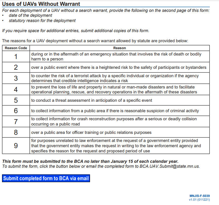 The form police departments use to explain their deployment of a drone without a warrant to be submitted and catalogued by the BCA. The summary data of police drone use statewide is to be published on June 15th of each year.