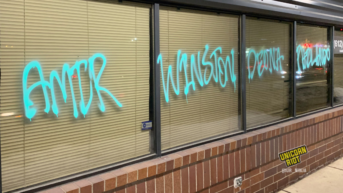 Graffiti was widely sprayed across available surfaces. Messages reading “Justice 4 Amir,” “Fuck 12,” and “Destroy MPD,” were widely used. Some windows were broken out of a bus stop as well as a building under construction.