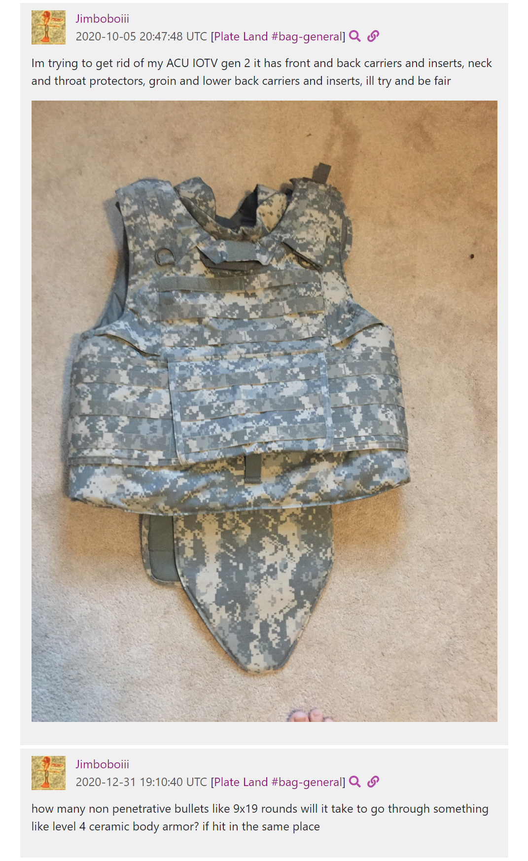 ‘jimboboii’ posted at least three images, including ammunition he said he purchased, and a camouflaged plate carrier. He also said that he had obtained access to Vietnam War-era items from his grandmother and the items were at her house. He also discussed trying to sell “military gear” particularly body armor, but said he had his eBay account suspended after trying to do so.