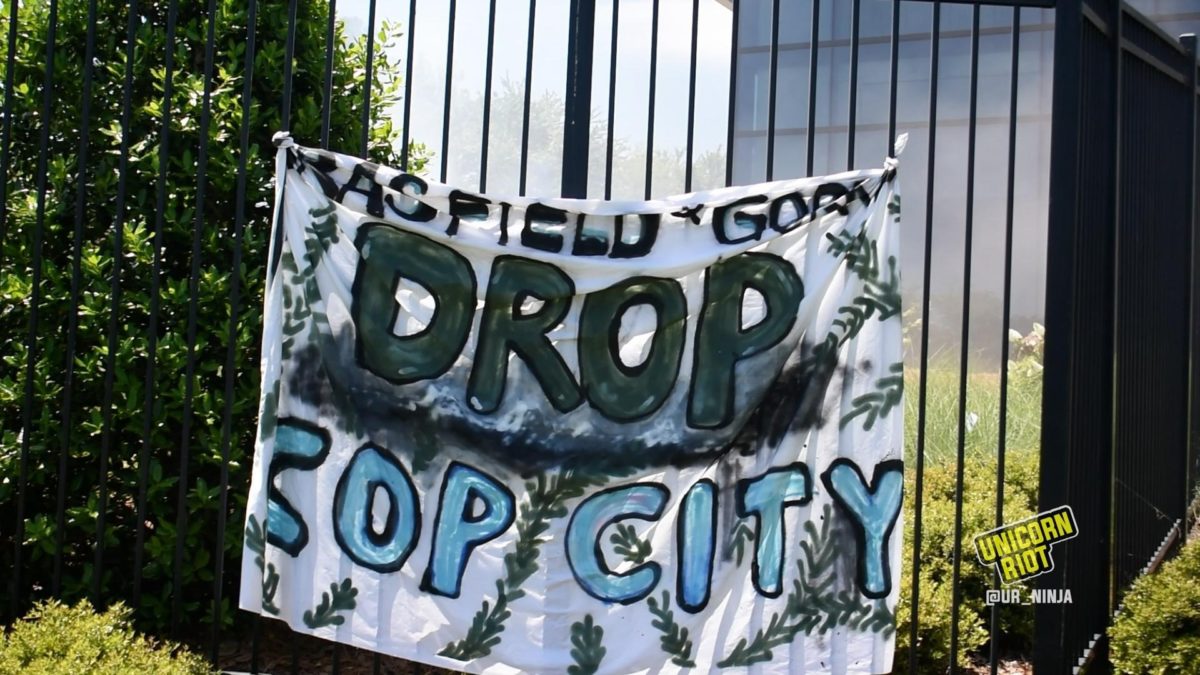 Slogans were scrawled across the Brutalist concrete exterior and fifteen foot tinted glass windows reading “No Forest, No Peace!,” “Trees Not Cops” and “Defend ATL Forest!” Paint bombs smashed across the face of the building leaving it blotted with mauve paint—the running streams of color stark against the white concrete.