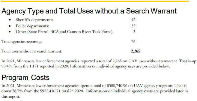 The data corroborates Weiland’s assertion. According to the BCA, “In 2021, Minnesota law enforcement agencies reported a total of 2,265 UAV uses without a warrant. That is up 93.4% from the 1,171 reported in 2020.” The SCAO report covering the same timeframe reveals, “four UAV warrants were granted and one UAV warrant was denied.” The previous year’s SCAO report indicated that zero warrants were applied for prior to law enforcement drone flights.