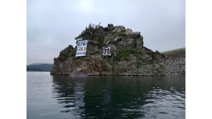 Silver City, SD – Early Monday morning, water protectors dropped banners at the Pactola Reservoir island in opposition to new proposed gold exploration in the Black Hills, or He Sapa. F3 Gold, a Minneapolis-based prospecting company, is waiting on one last permit approval before they can begin their exploration activities, which they say will “have very minor, or no environmental impacts.”