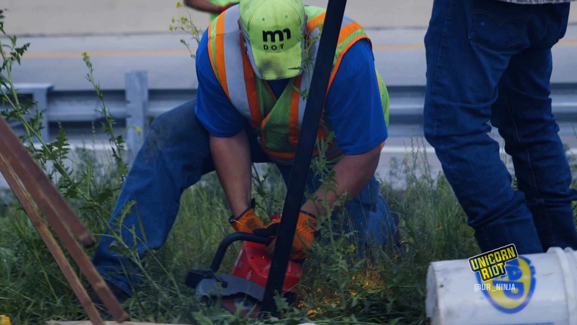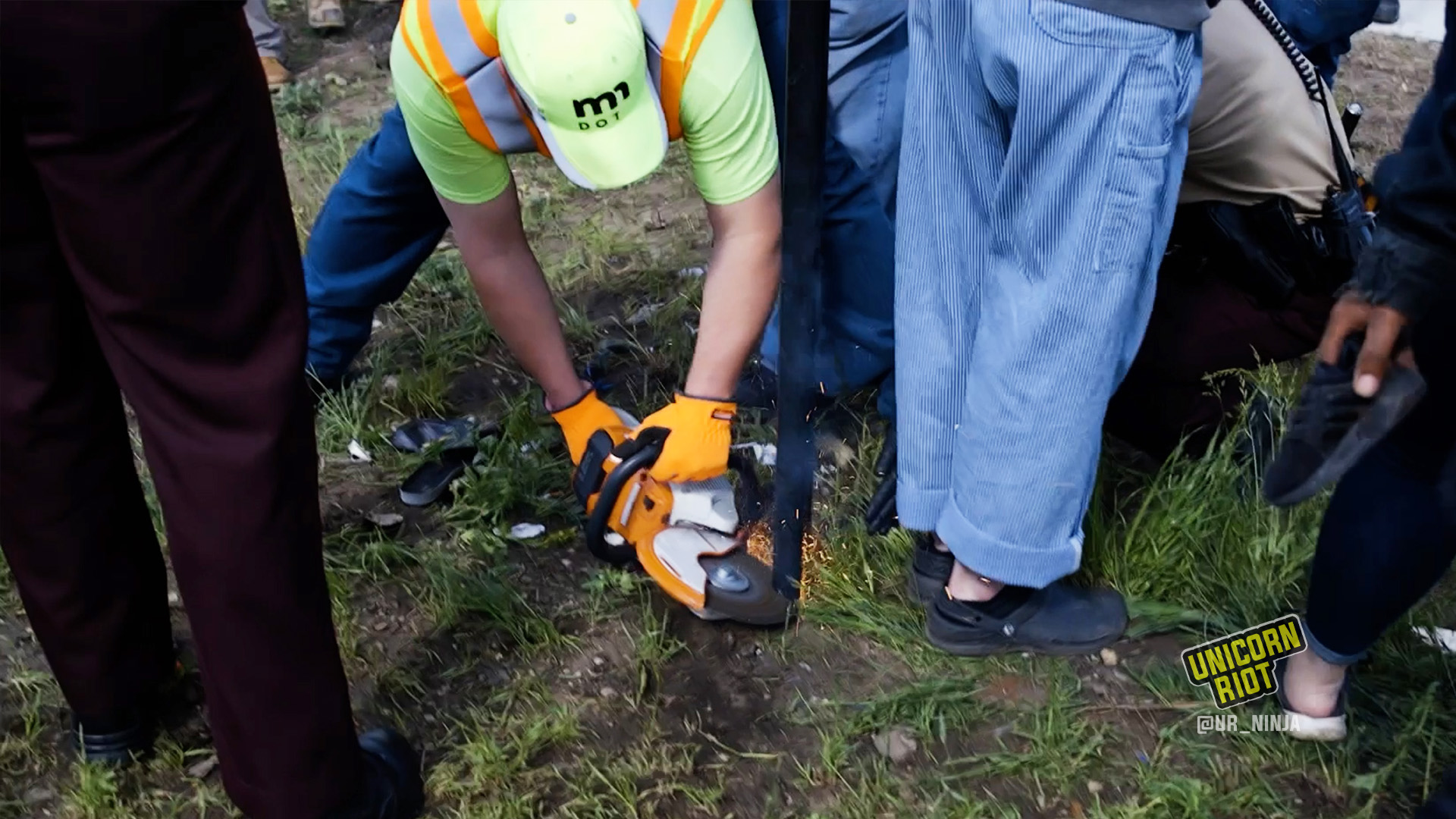 The encampment was separated from the interstate by a chain-link fence, and in preparation for clearing the area, MnDOT crews cut the fence with power saws. They didn’t take any tents, nor did they attempt to. At times, eviction defenders stood in the way, or near where MnDOT workers were cutting the poles and fencing.