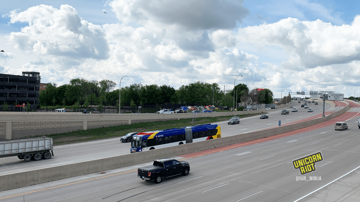 Minneapolis, MN – On June 1, 2022, authorities unsuccessfully cleared an encampment of tents on an unused strip of land off Interstate 35. Eviction defenders thwarted the sweep by asking for documents, helping residents pack and move, and using their bodies and placing objects in the way of authorities. Despite aggression from the contractors hired for the eviction cleanup, no tents were taken. Yet, all residents have since moved.
