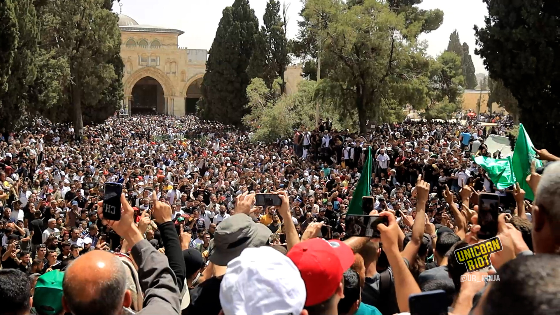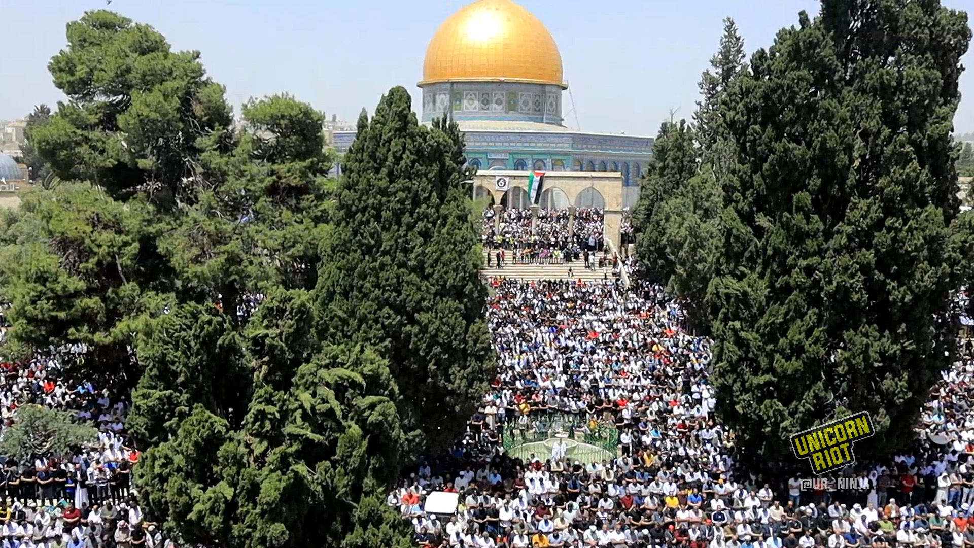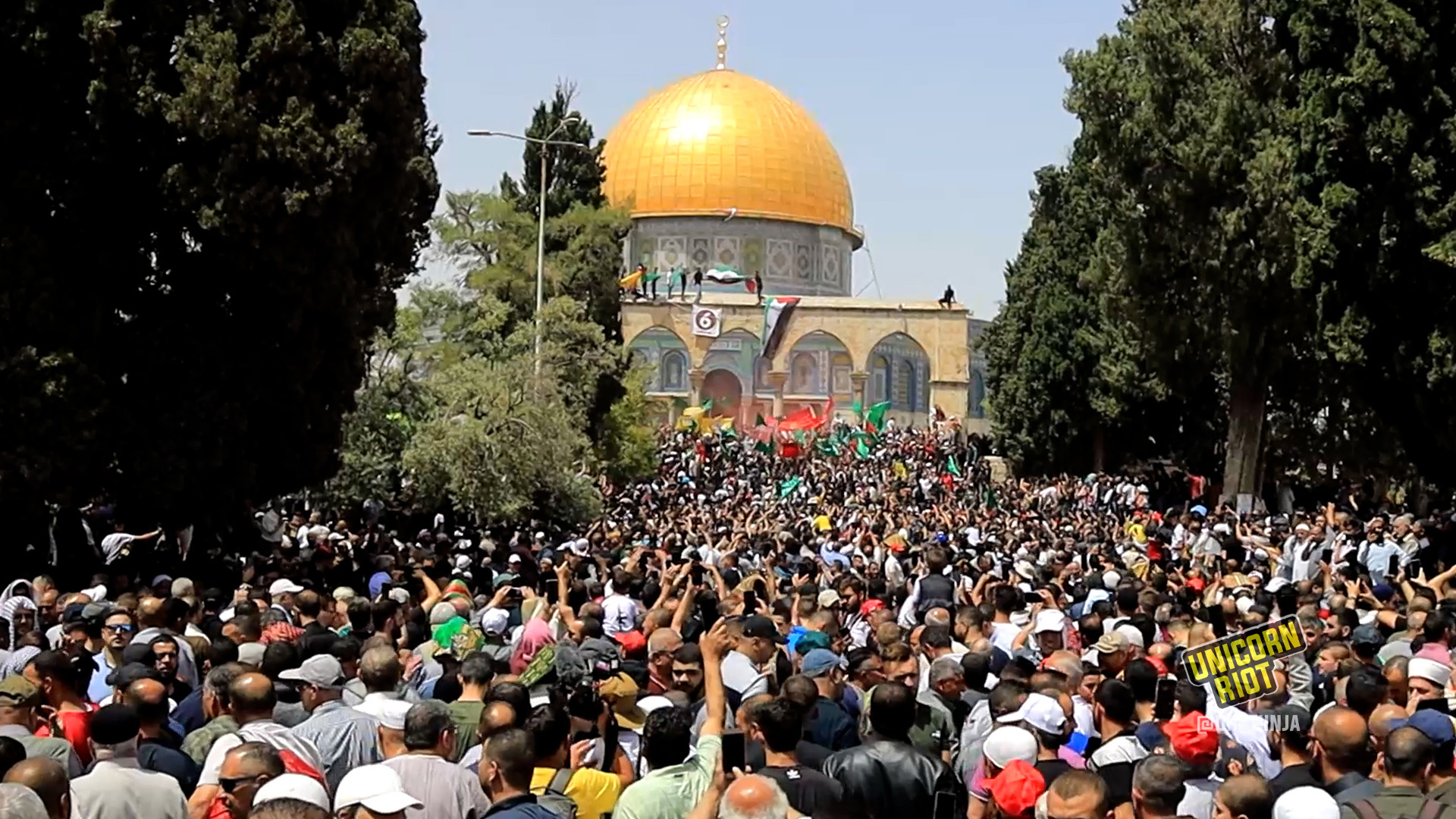 In the afternoon, worshippers and those gathered in the courtyard of Al-Aqsa chanted slogans like “I swear to God, the Most High, the Great, that we protect the blessed Al-Aqsa Mosque.”