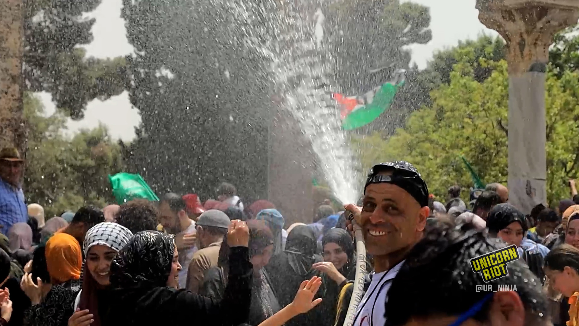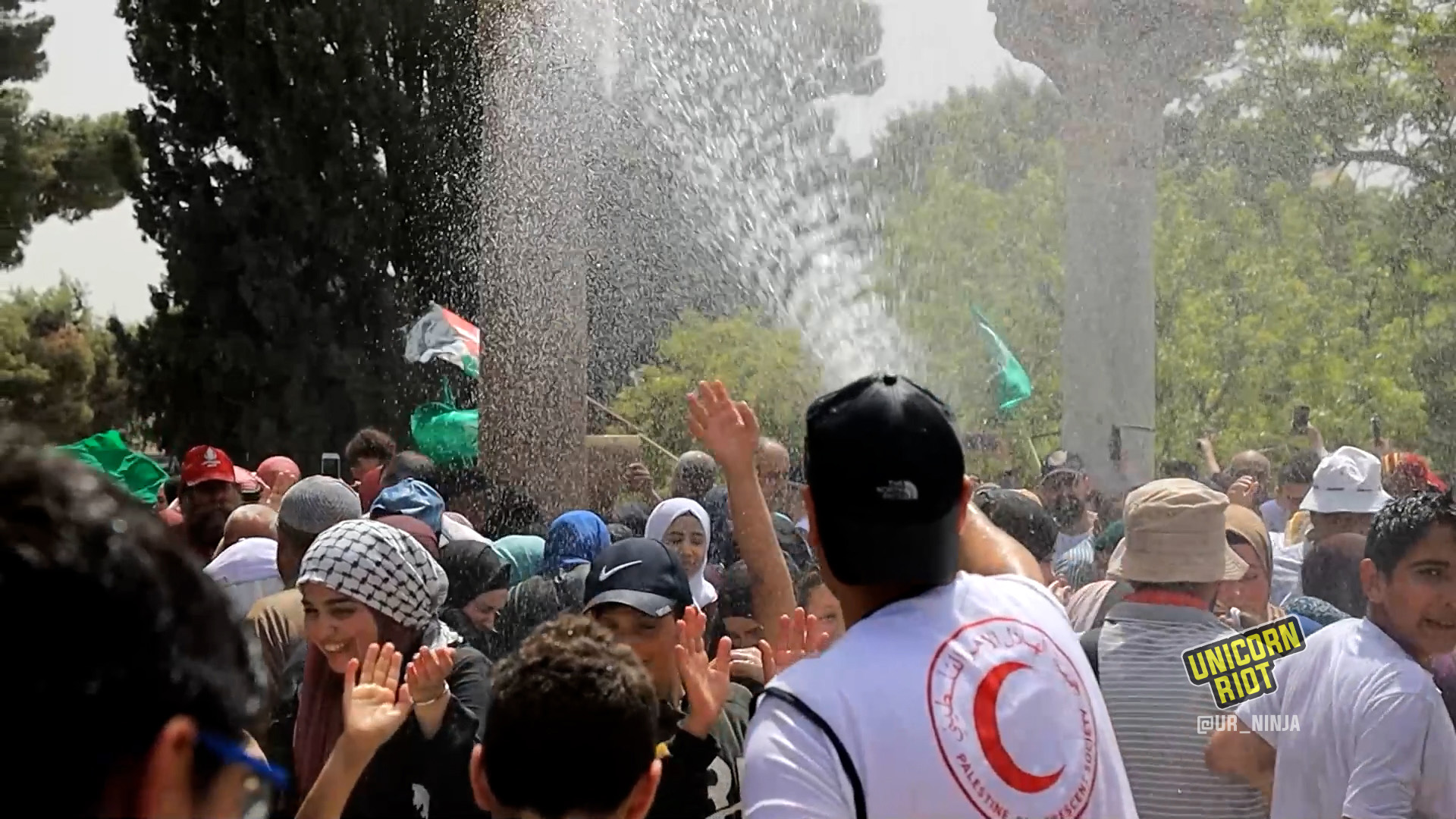With temperatures topping out at 87 degrees Fahrenheit, worshippers were doused with water hoses later in the afternoon by Red Crescent members.