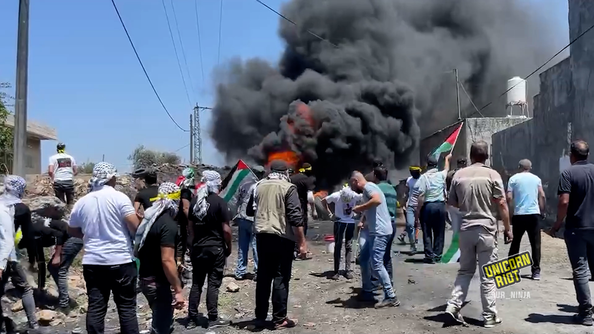 Extended heated confrontations took place through the daytime with dozens of young men blocking Amman Street with burning tires and rocks obstructing occupation patrols amid heavy firing of bullets, sound bombs and tear gas.