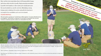 Patriot Front’s increased internal security measures include a “full pat down“ and confiscating cell phones during road trips and camping get-togethers. Those vetting new members are instructed to “clandestinely record the license plate information or obtain a picture of that new member’s face” and require applicants to empty their pockets and be checked for wires.