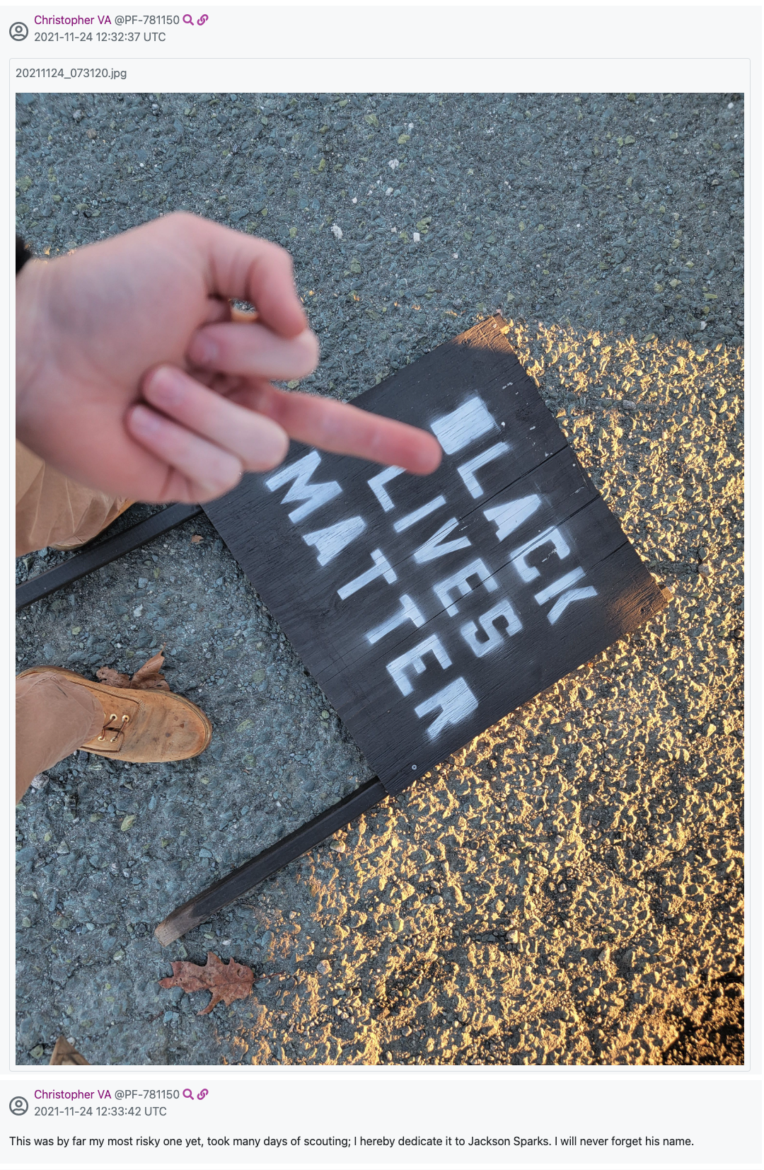 Leaked messages sent by ‘Christopher VA‘ in Patriot Front’s RocketChat server show that his involvement in apparently illegal acts of racist harassment was not limited to the Ashe mural. On Nov. 23, 2021, he posted a picture of a stolen Black Lives Matter yard sign and commented about his potential legal liability – “this was by far my most risky one yet, took many days of scouting.” Three weeks later on Dec. 15, he posted a picture of himself stepping on another two stolen yard signs.