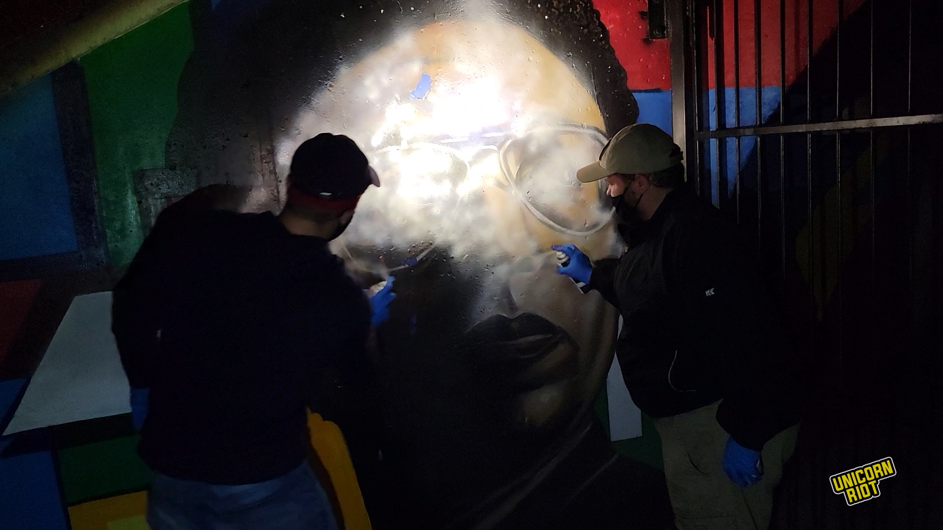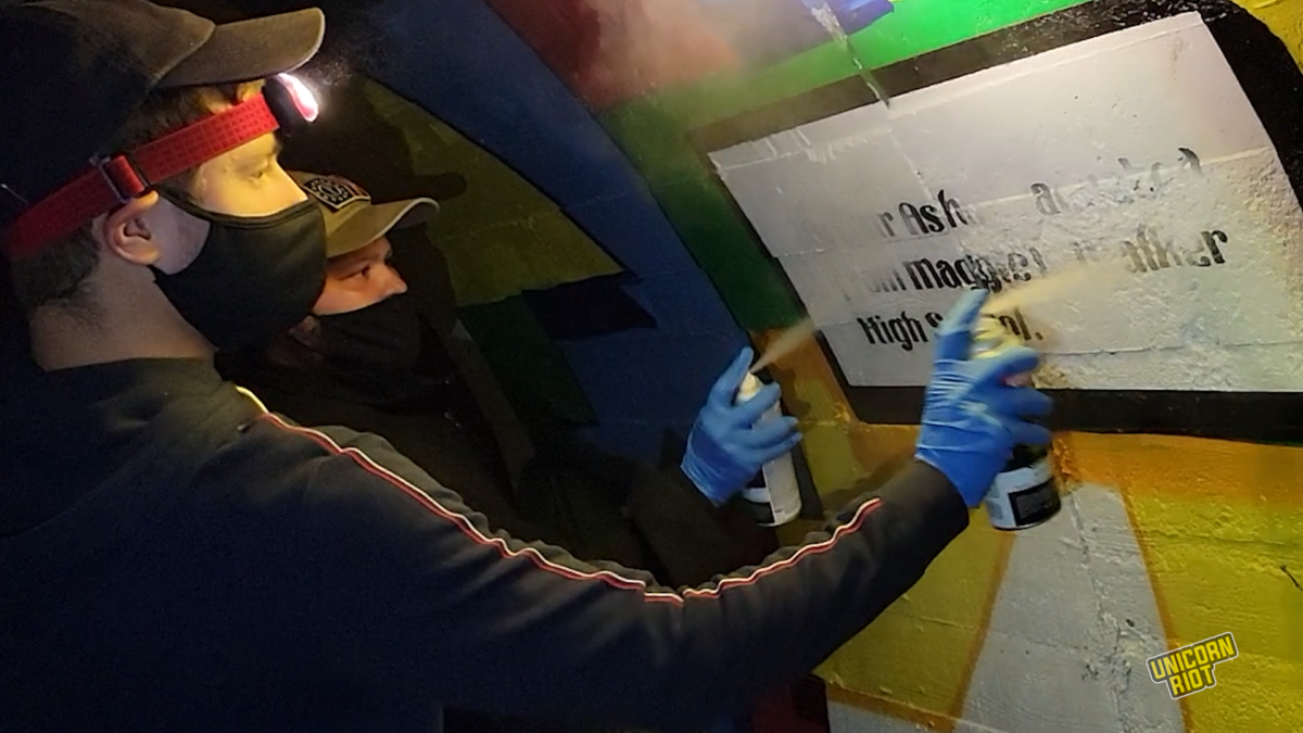 Patriot Front members Nathaniel J. Noyce of Glen Allen, VA and Thomas Dail of Wake, VA (both age 24) are clearly seen spray painting over the mural in the leaked footage, wearing COVID masks and blue latex gloves.