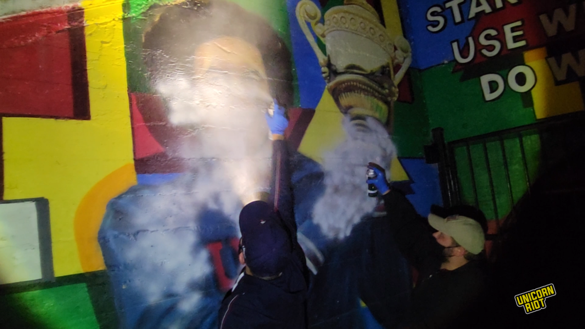 The young fascists then moved onto another painting of Ashe in the same area, a taller profile showing Ashe holding the Wimbledon Cup. Noyce and Dail painted over the second mural as well, with Noyce reaching up on his tiptoes to be able to spray over Ashe’s face.