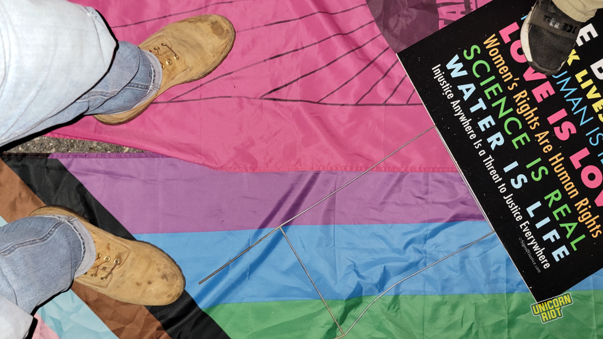 Video taken slightly later that night shows Noyce and Dail spray painting more Patriot Front stencils onto concrete walls underneath a bridge by a river. An additional photo included in leaked Patriot Front media archives from that night shows their shoes stepping on a pro-diversity yard sign and a transgender pride flag, which were likely stolen as “trophies.”