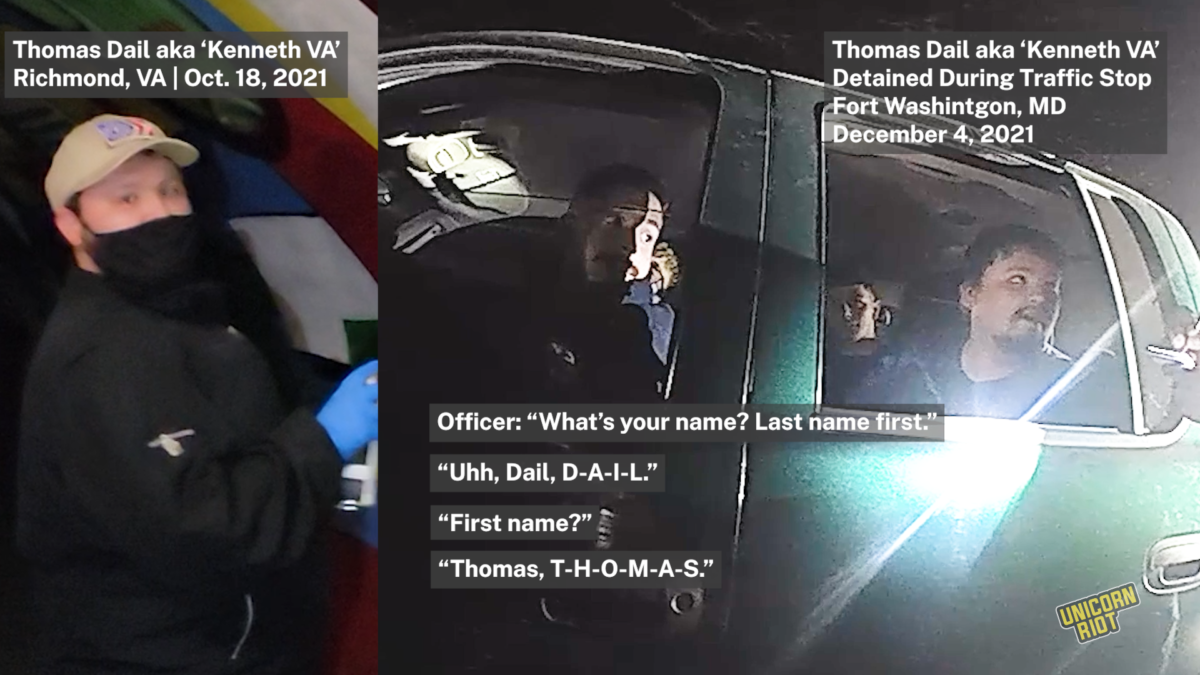 The masks did not cover much of their facial features. Noyce and Dail are also seen in police body camera videos from a Dec. 4, 2021 traffic stop uncovered by Unicorn Riot in which both men identified themselves by name to police detaining them in Fort Washington, Maryland. Noyce was also filmed vandalizing the mural while wearing a sweatshirt he previously wore in a 2019 photo posted to Facebook.