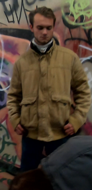 Logan Plank aka ‘Clarke IL‘ is seen clearly in the leaked video unloading spray cans from the trunk of a car parked blocks away from the Phoenix Center shortly before he helped Garret Garland (‘Randolph IL‘) and Mitchell Wagner (‘Kyle MO‘) deface the mural while Luke Paule (‘ND – Carter MO‘) and Daniel Springer (‘Sam MN‘) waited nearby. The sleeve of a brown jacket worn by Plank that night can be seen on an arm holding up a Patriot Front stencil to the mural while Mitchell Wagner sprays paint through the stencil’s cut-out letter shapes onto the building.