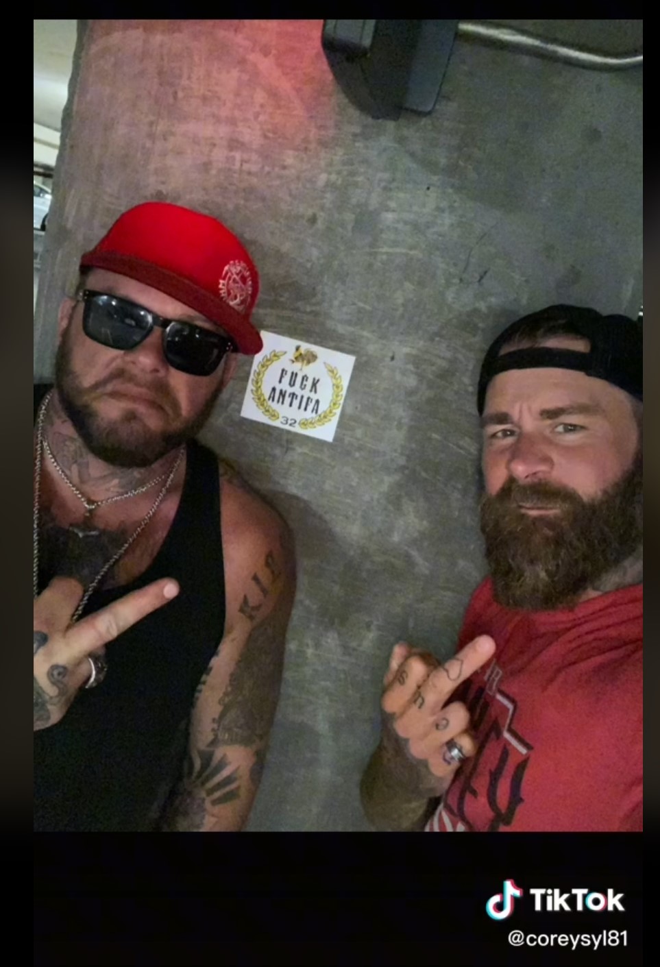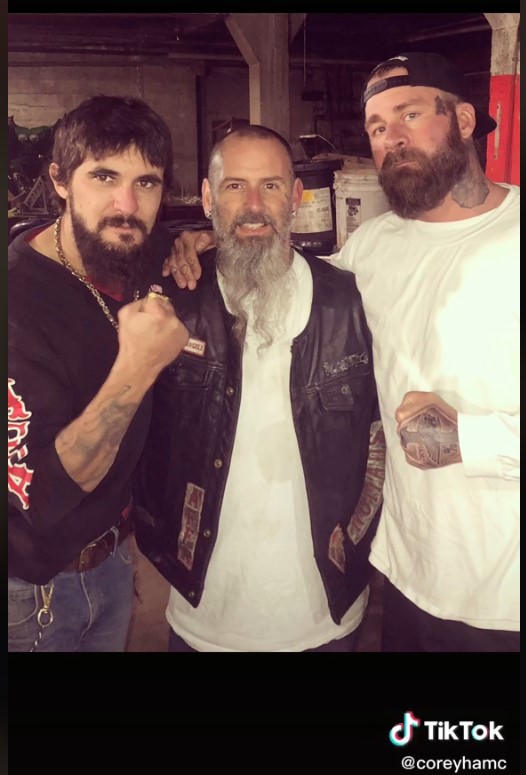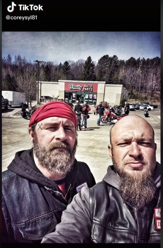 Nielsen’s TikTok images show a motorcycle club lifestyle dotted with far-right references. He’s posted images with Tucker Carlson, calling attention to items like anti-Antifa swag and holding an “Aryan Barbarian” plate. Some clips also show gas station encounters with groups of police that appear to be detainments of other Hell’s Angels members.