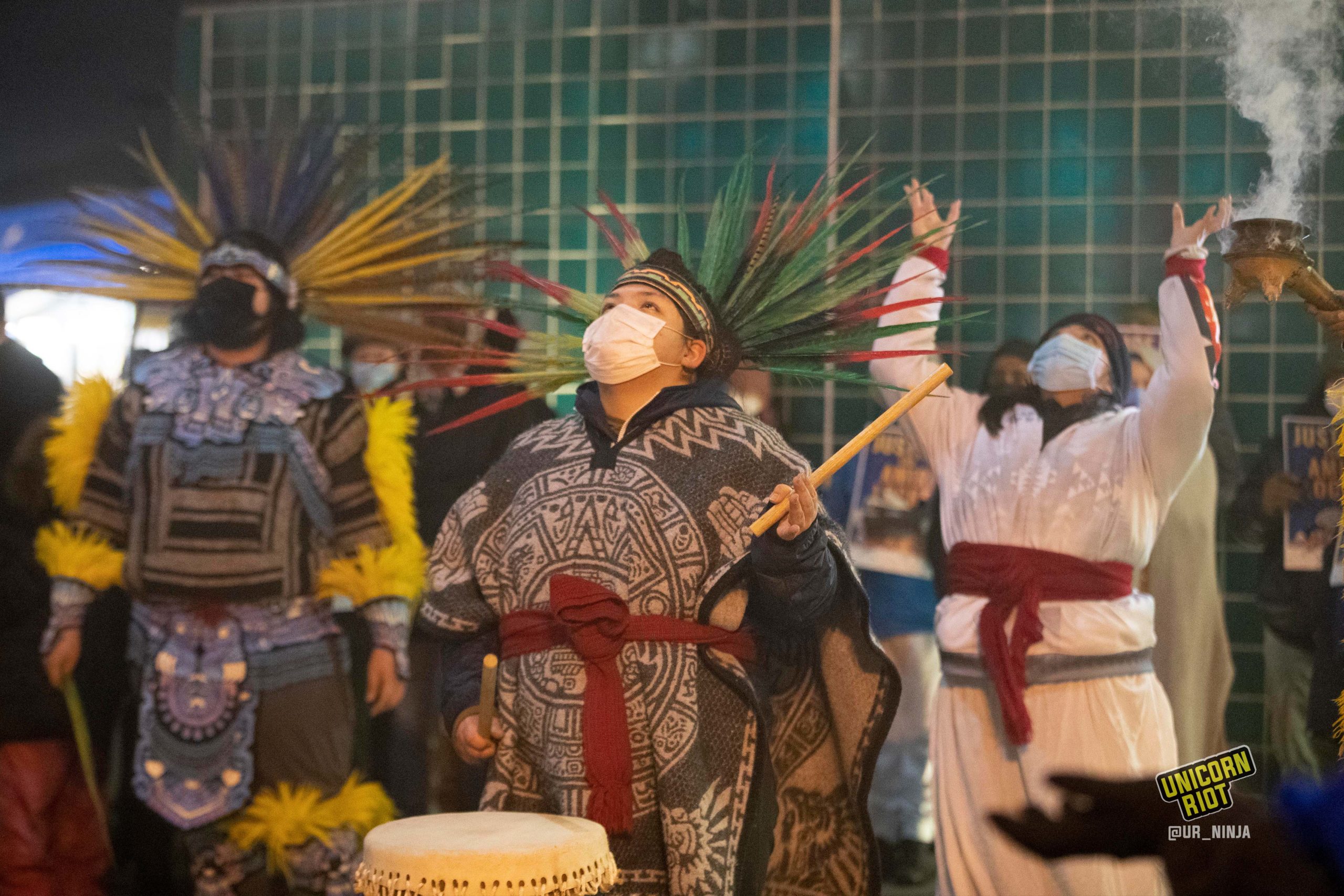 Kalpulli Yaocenoxtli performed ceremonial dances outside the POST Board before the protest ended with the Assata Chant.