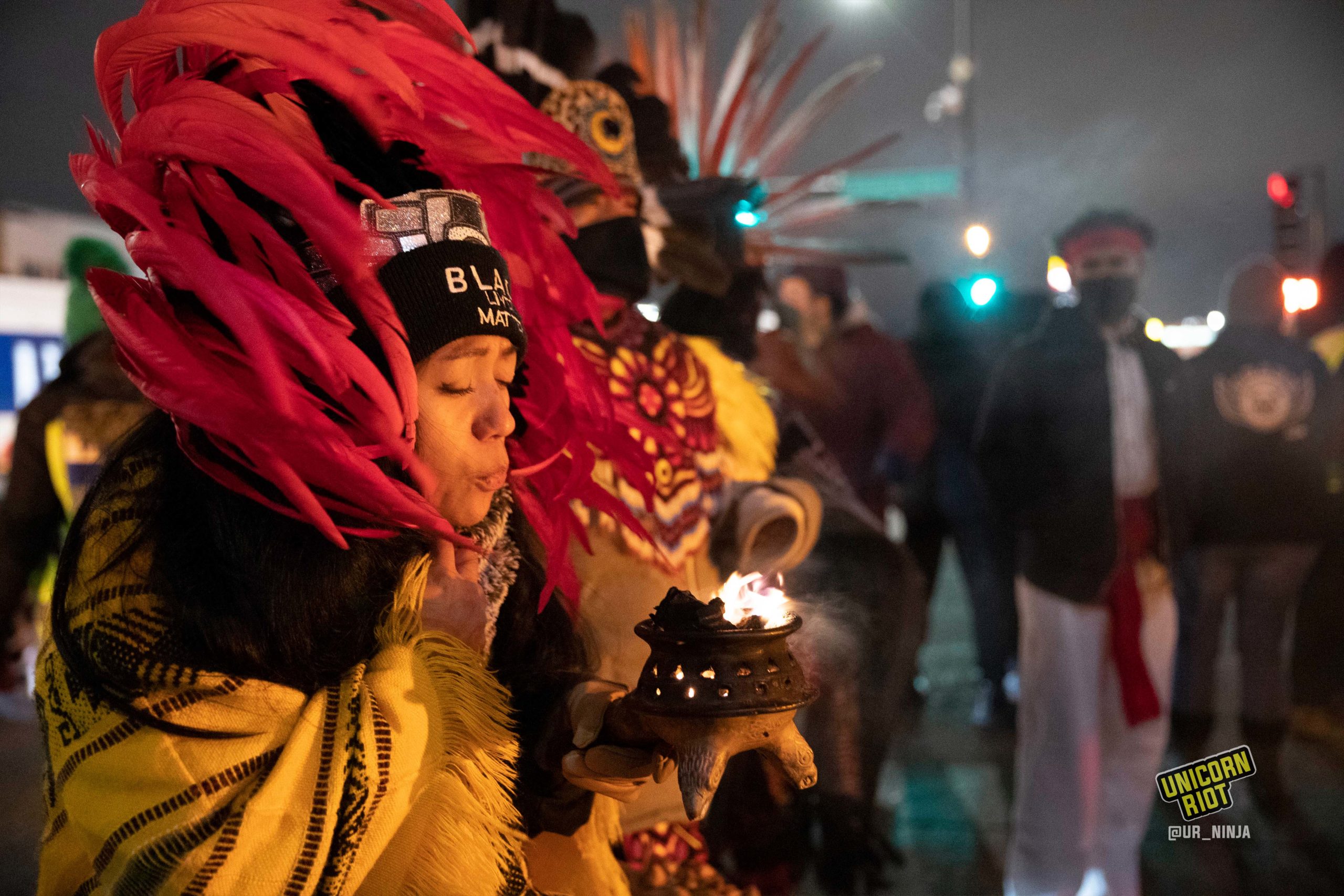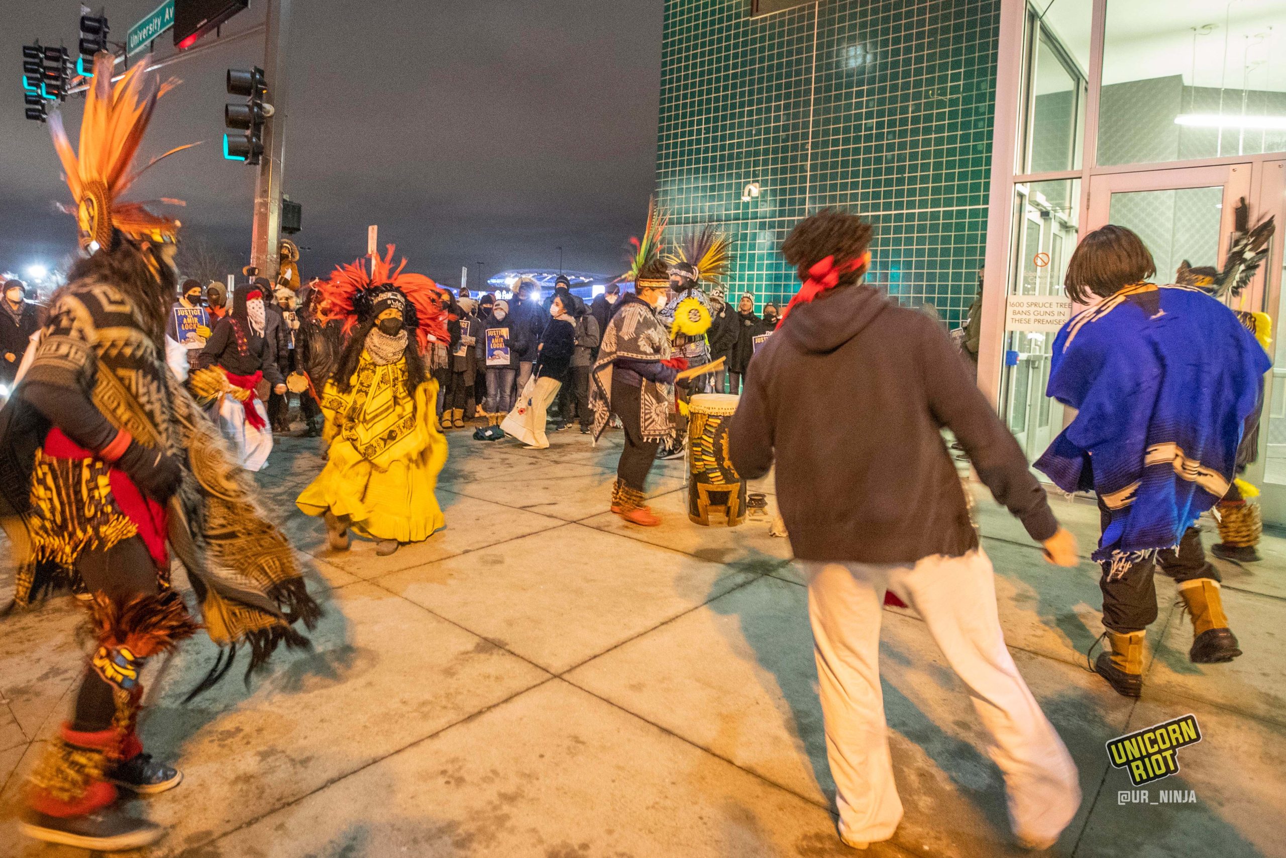 St. Paul, MN – Upwards of 60 people protested the police killing of Amir Locke outside the Minnesota Board of Peace Officer Standards and Training (POST) on February 9, 2022. Speakers demanded accountability, reform to police training and Mexica-Nahua (Aztec) performers provided a ceremonial dance.