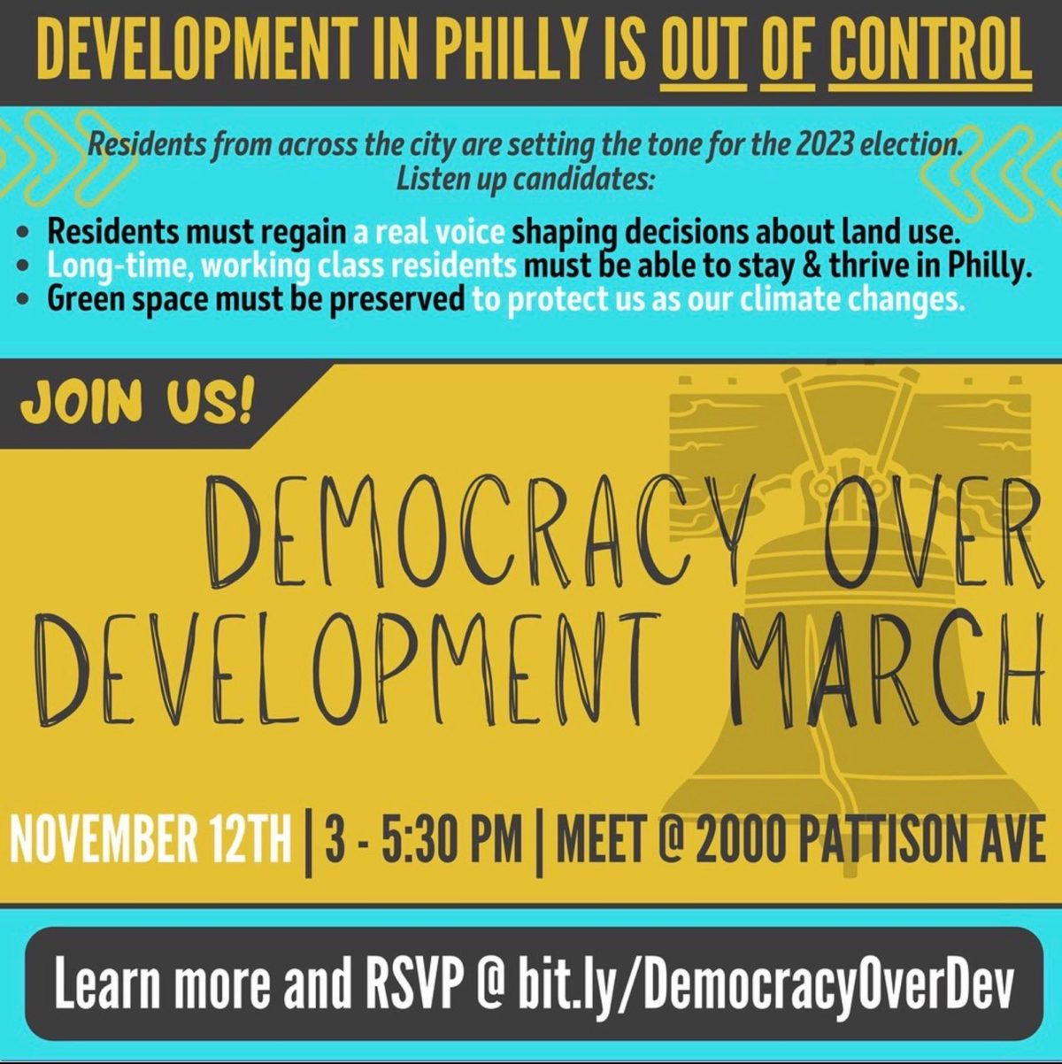 Organizer flyers included some of the key concerns. According to an event page the attendee groups include “Philly Thrive, Sunrise Movement, VietLead, Save UCTownhomes, Save the Meadows, RECLAIM, PSL, Cobbs Creek EJ”.