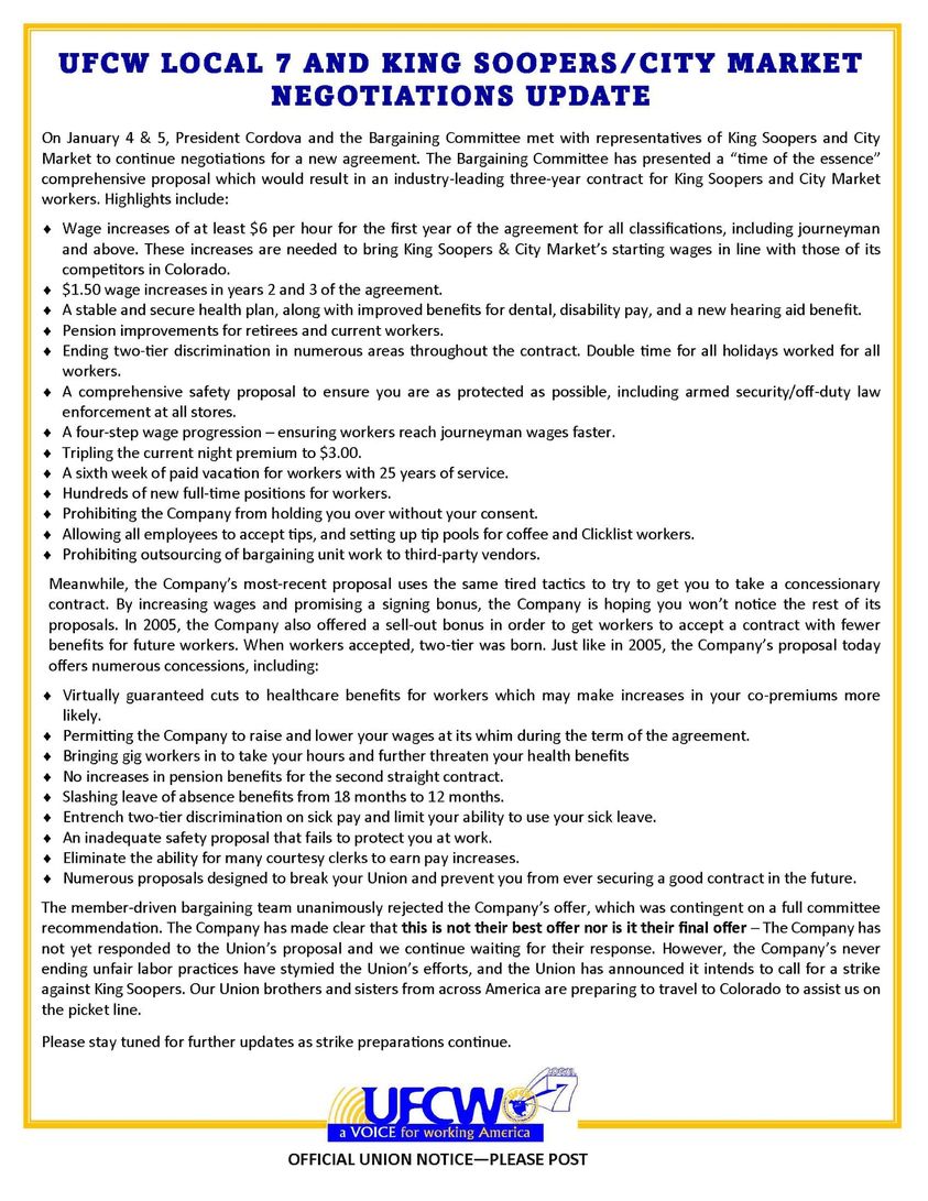 On Thursday afternoon Kim Cordova, president of UFCW Local 7, sent a letter to King Soopers signaling that the union was ready to continue with negotiations on Friday. In the letter, Cordova requested the attendance of King Soopers/City Market President Joe Kelley, who she stated “has yet to make time in his schedule for one of these meetings for longer than nine minutes.”