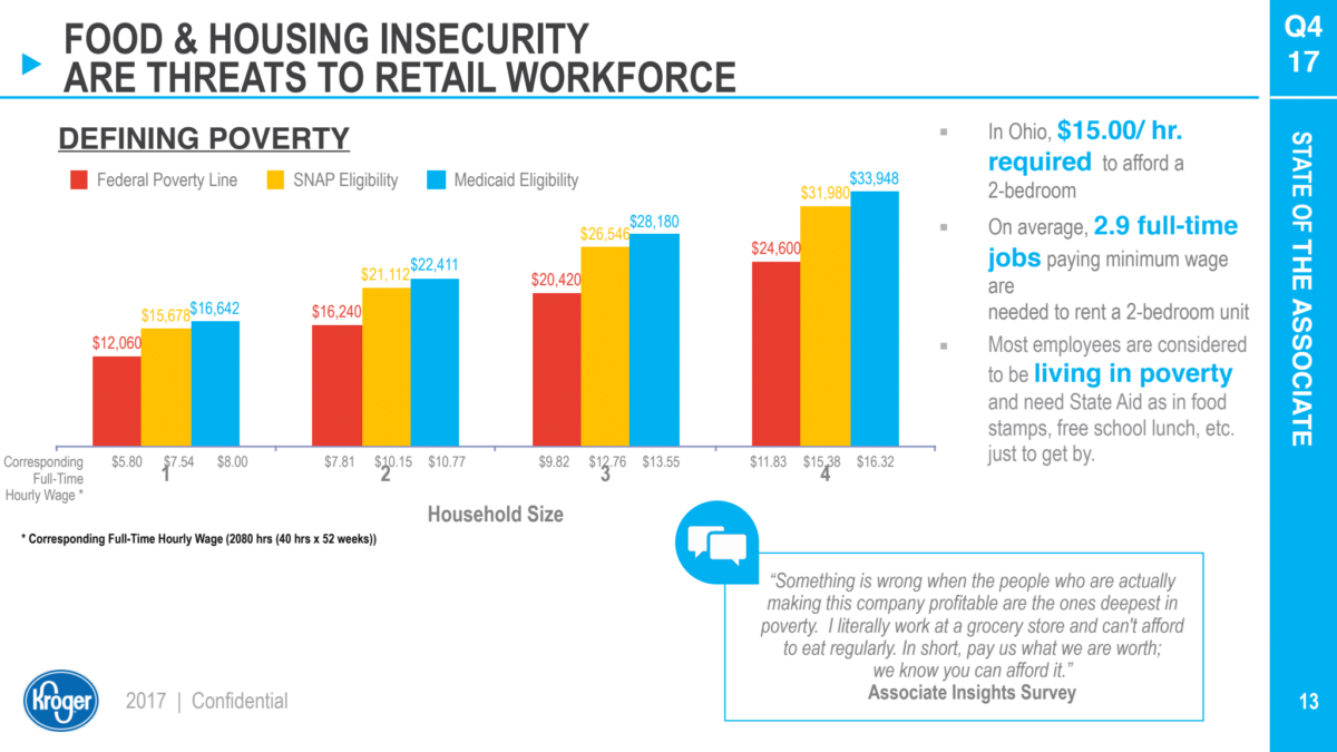 In a leaked Kroger ‘State of the Associate’ internal presentation (obtained by More Perfect Union), the company reported that 1 in 5 associates get SNAP or WIC assistance, and “most employees are considered to be living in poverty.”