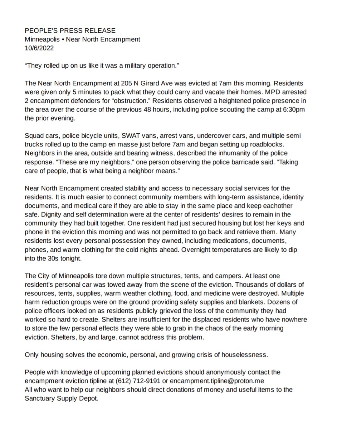 People with knowledge of upcoming planned evictions should anonymously contact the encampment eviction tipline at (612) 712-9191 or encampment.tipline@proton.me