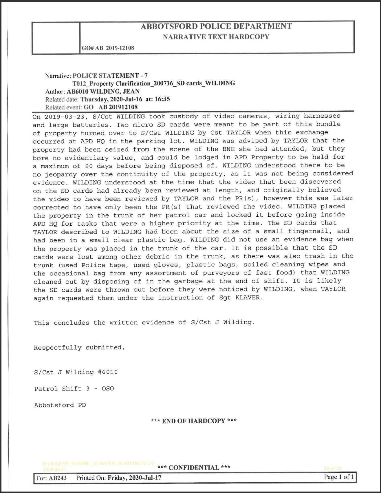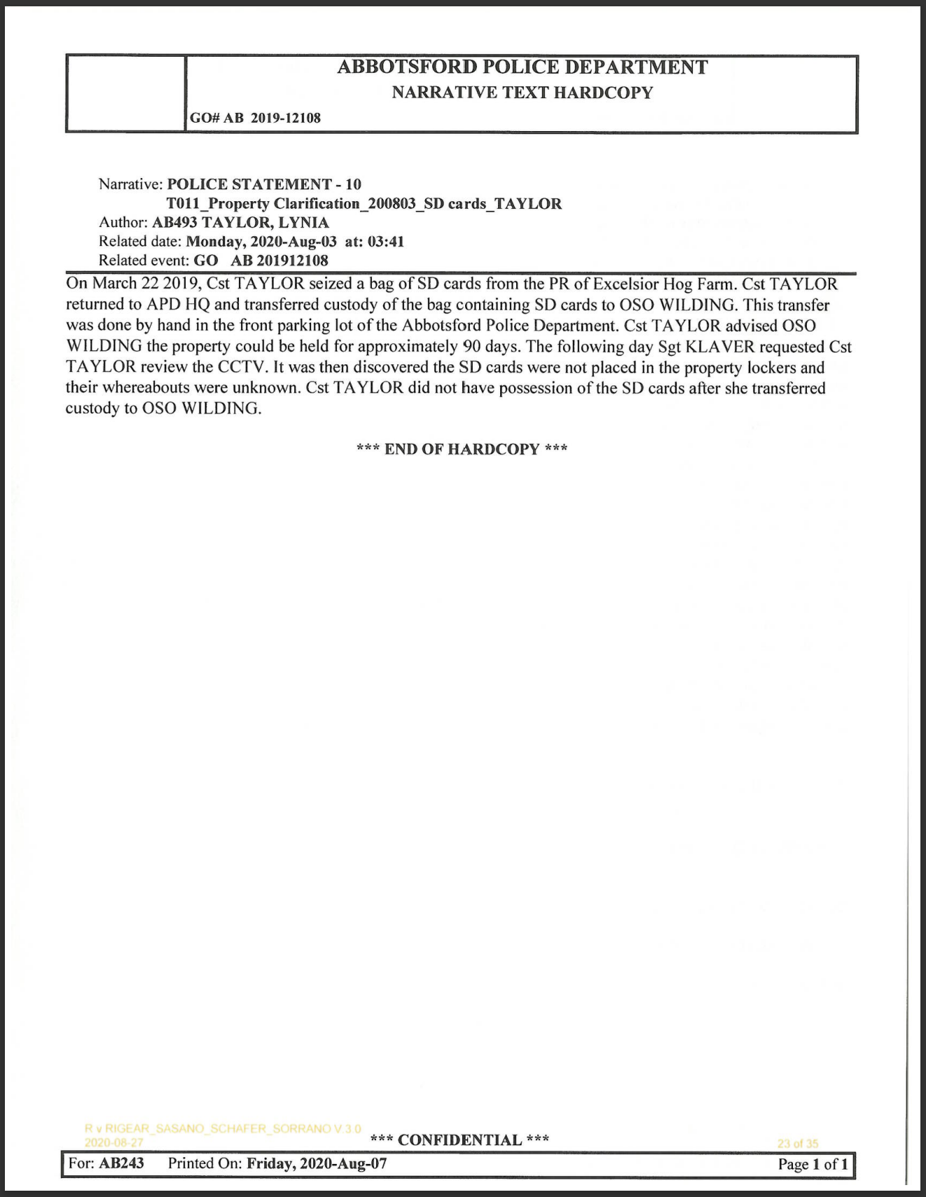 On March 22, 2019, Constable Taylor “seized a bag of SD cards from the PR of Excelsior Hog Farm” from hidden cameras an Excelsior worker found on the property, and handed it over to Operational Support Officer (OSO) Wilding back at the police department headquarters. The following day, a sergeant asked Constable Taylor to review the footage on the SD cards, however when she went to the property lockers, they were not there and could not be located.
