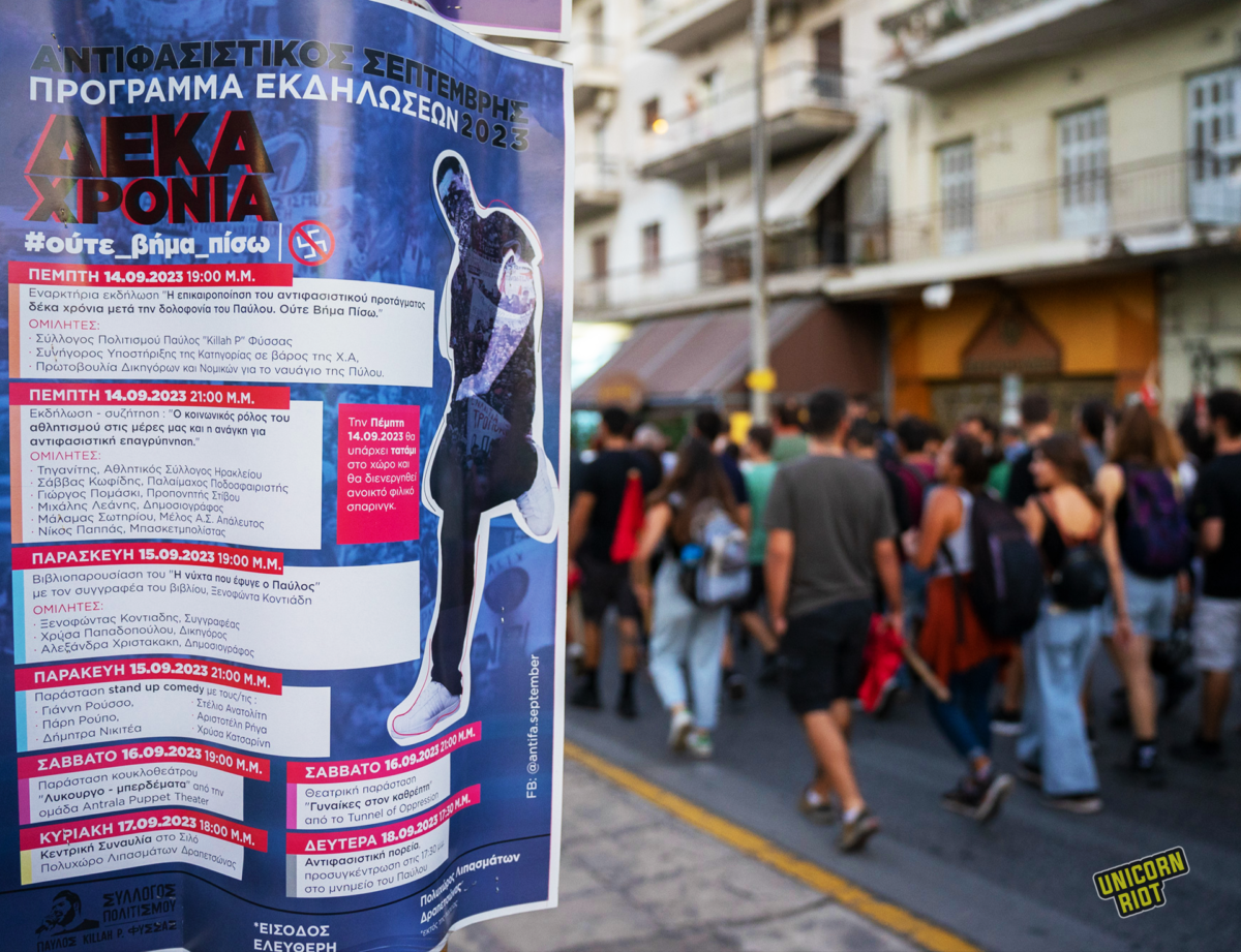 Athens, Greece – As on every September 18 since 2013, thousands of people marched in memory of the antifascist musician Pavlos ‘Killah P’ Fyssas and filled the street renamed in his honor, Pavlos Fyssas Avenue. Starting at the memorial site where Fyssas was murdered by Golden Dawn members in Keratsini, a western suburb of Athens, the march marking 10 years since his killing was led by his family and friends.