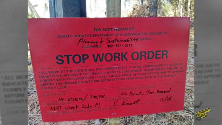 DeKalb County did, however, issue a ‘Stop Work Order’ to Ryan Millsap and Blackhall Real Estate Phase II, LLC on Dec. 28. The order was issued because Millsap failed to acquire the necessary permit to legally remove trees. As of Jan. 16, 2023, the order remains posted at the park.